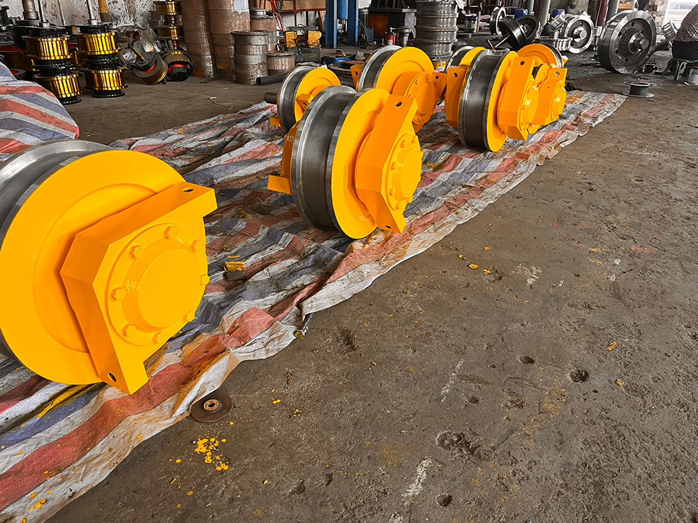 起重机车轮组:起重机运行机构车轮的水平偏斜值是起重机重要的技术参数,偏斜值超差会造成啃轨,增大运行阻力,产生振动和噪音,加剧轨道和车轮磨损,大大降低起重机使用寿命,所以各类起重机制造技术条件都要对车轮水平偏斜规定允许的数值。